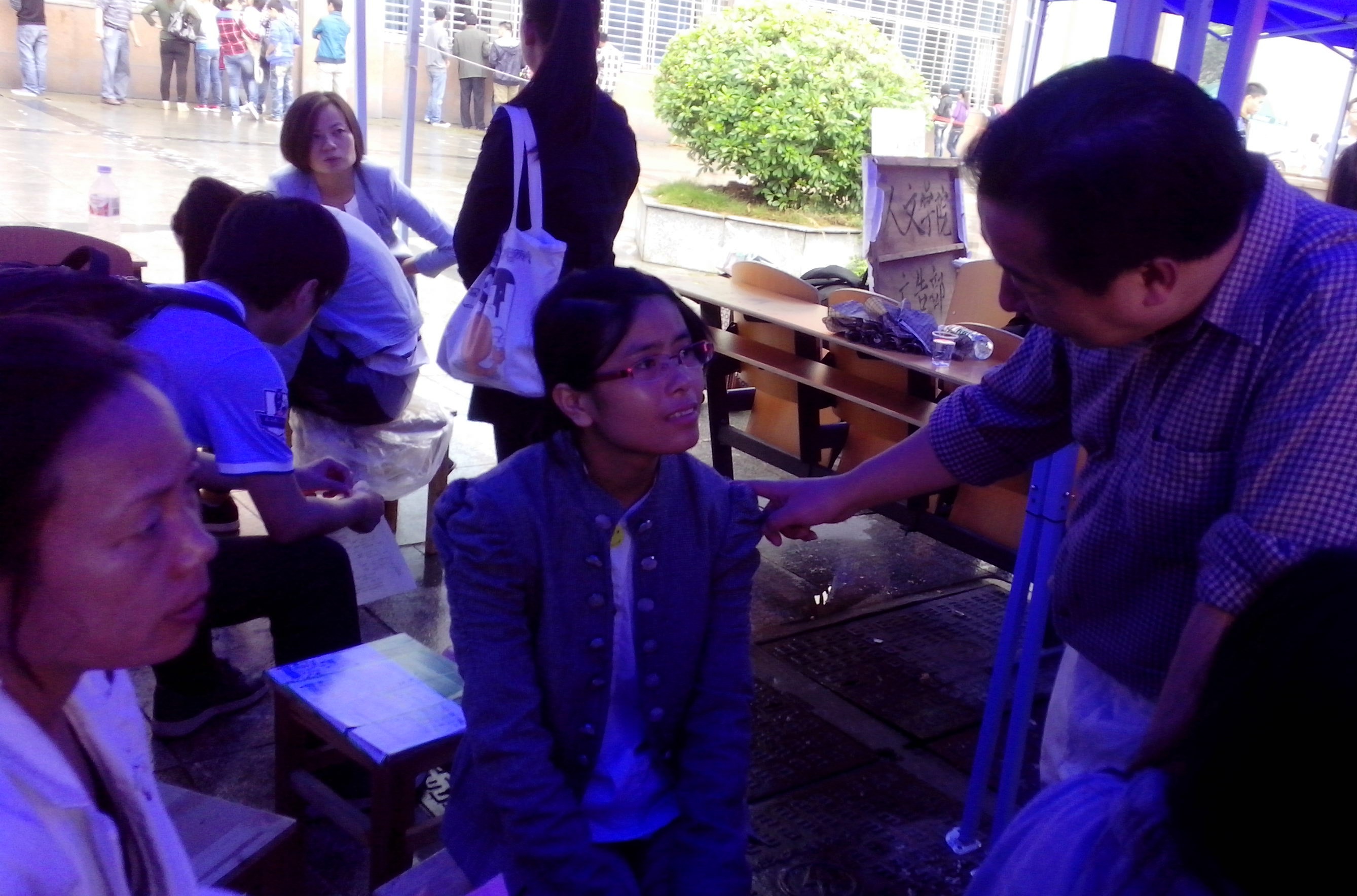 在今年教育学院的迎新工作中,整个大二年级的学生都投入其中做志愿者,热心的为新生服务。他们坚守在南北校区的迎新一线,帮新生拿行李,为他们指路,带领他们到指定地点领取军训服、钥匙、卧具等,并在路上给他们介绍学校情况,耐心地回答新生及其家长提出的一个又一个问题。冰冷的秋雨并没有浇褪他们为学弟学妹真心服务的热情,他们不顾自己把雨伞让给新生,到最后衣衫都湿透了也未显露一丝的不耐与抱怨,学弟学妹那一声声会心的“谢谢学长、学姐!”是对他们最好的报答!