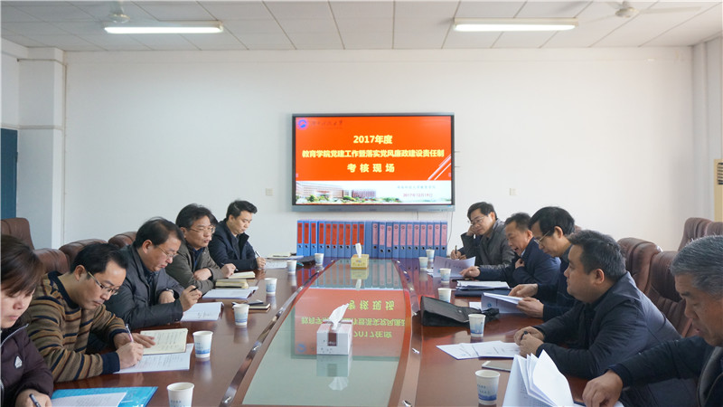 20171219日上午,八教208会议室,校党委朱川曲副书记带队,学校基层党建工作暨落实党风廉政责任制建设考核工作组(党办校办戴树根主任、商学院潘爱民书记、艺术学院曾志东书记、党委党校彭雪贵副校长、党办校办行政科罗芽松科长)对教育学院2017年党建工作暨落实党风廉政责任制建设情况进行现场考核。考核工作组认真查阅我院党建工作与落实党风廉政责任制建设情况相关材料。