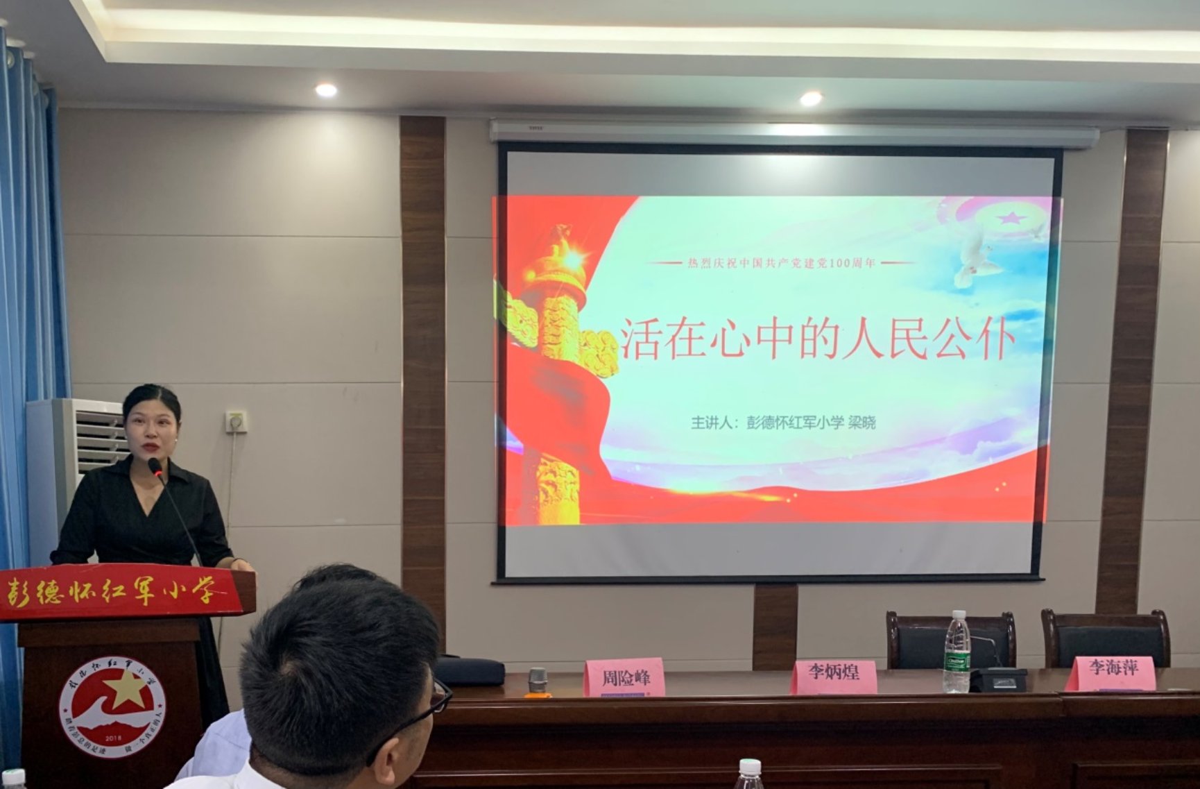 走进彭德怀红军小学,在学校“小解说员”的带领下,党员们了解了该学校红色教育特色,在“传承红色基因,弘扬红色文化”主题讲座上,党员们听取了优秀思政教师梁晓的“活在心中的人民公仆”微党课,观看一张张珍贵图片,聆听一段段动人故事,接受了一次深刻的党史学习教育和革命精神洗礼。