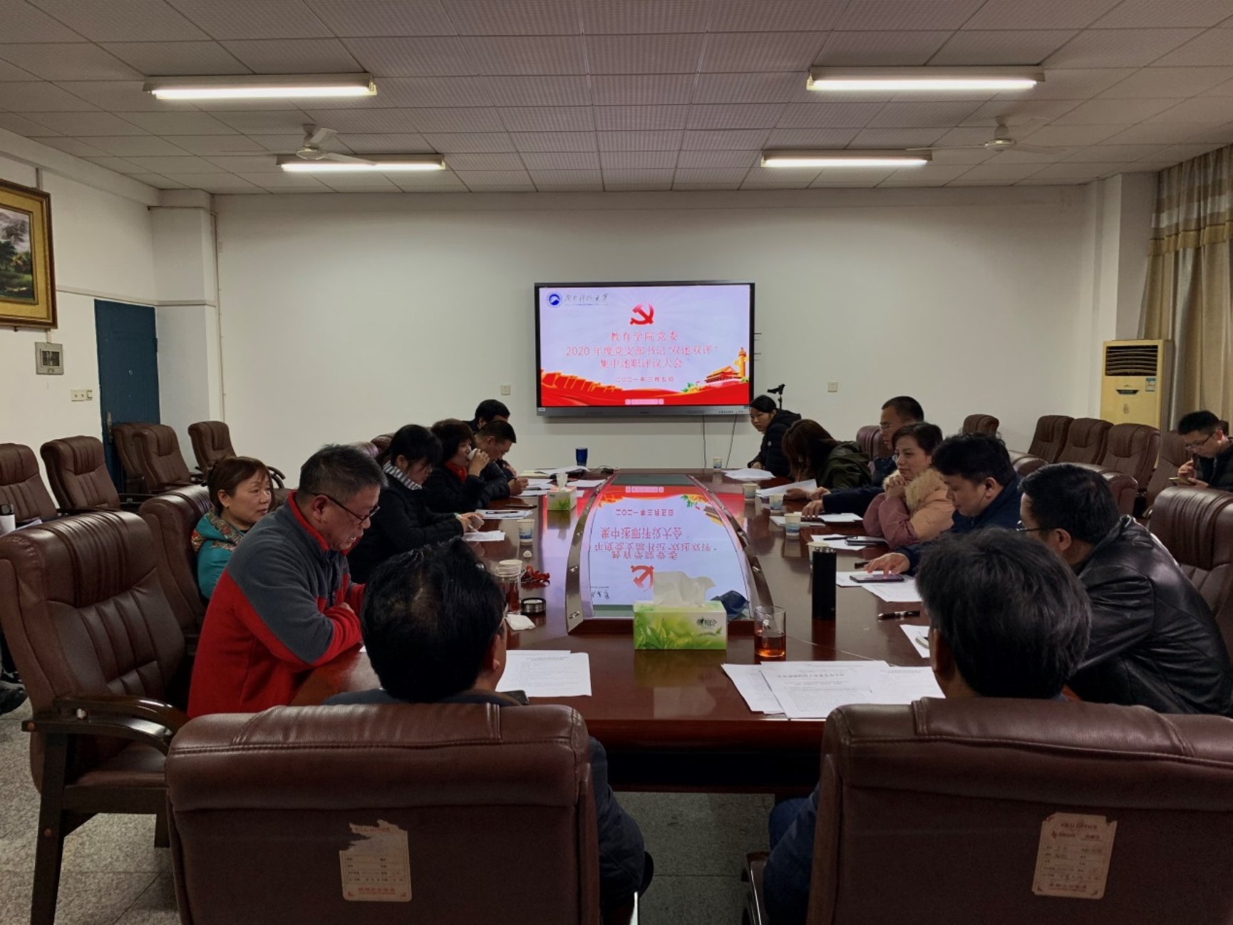 您所在的位置: 首页» 党建工作» 党务工作 教育学院召开2020年度党支部书记“双述双评”集中述职评议大会 时间:2021-03-05 19:36:00 2021年3月5日,我院2020年度党支部书记“双述双评”集中述职评议大会在八教208会议室召开。会议由院党委书记李炳煌主持,院党委委员、党支部书记、党员代表参加。党支部书记逐一向大会述职,接受党委书记点评和与会人员评议。根据述评情况,结合日常工作表现,与会人员对9位党支部书记进行综合评议,胡银华同志为优秀,其他8位党支部书记均为称职。