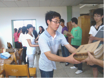 在活动当中,志愿者们累并快乐着,不怕苦,不怕脏。在最后一次图书整理中,图书馆老师、“小红帽”志愿者和支部志愿者更是协同合作,排成两条长龙,将书本从一头传向另一头,欢声笑语伴随着大家。