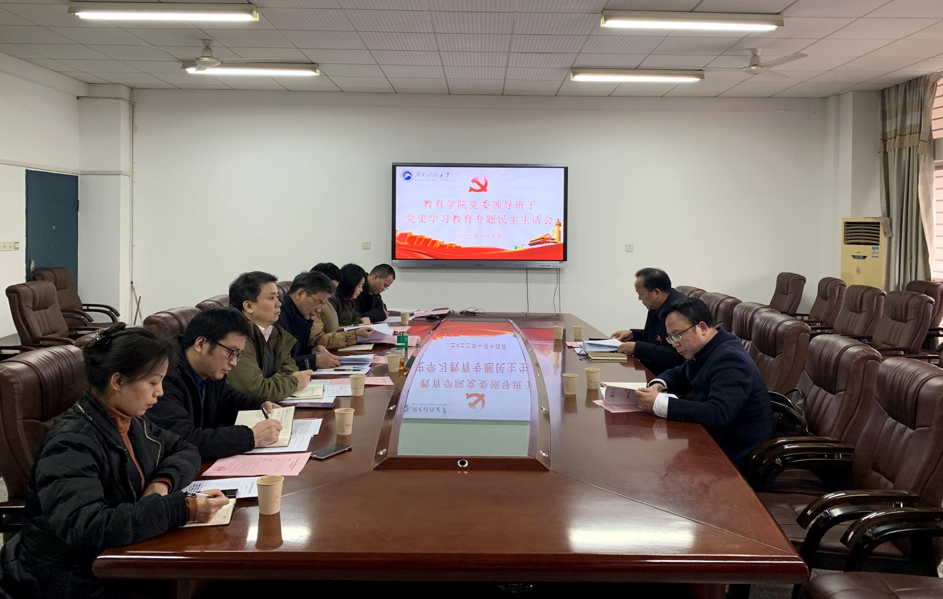 2022年1月14日,教育学院(教育科学研究院)2021年度党委领导班子党史学习教育专题民主生活会在八教208会议室召开。学校党委督导组校党委委员、纪委书记郭时印同志,校纪委副书记谢政才同志到会指导。会议由院党委书记李炳煌主持,院党委委员、党外处级干部参加。