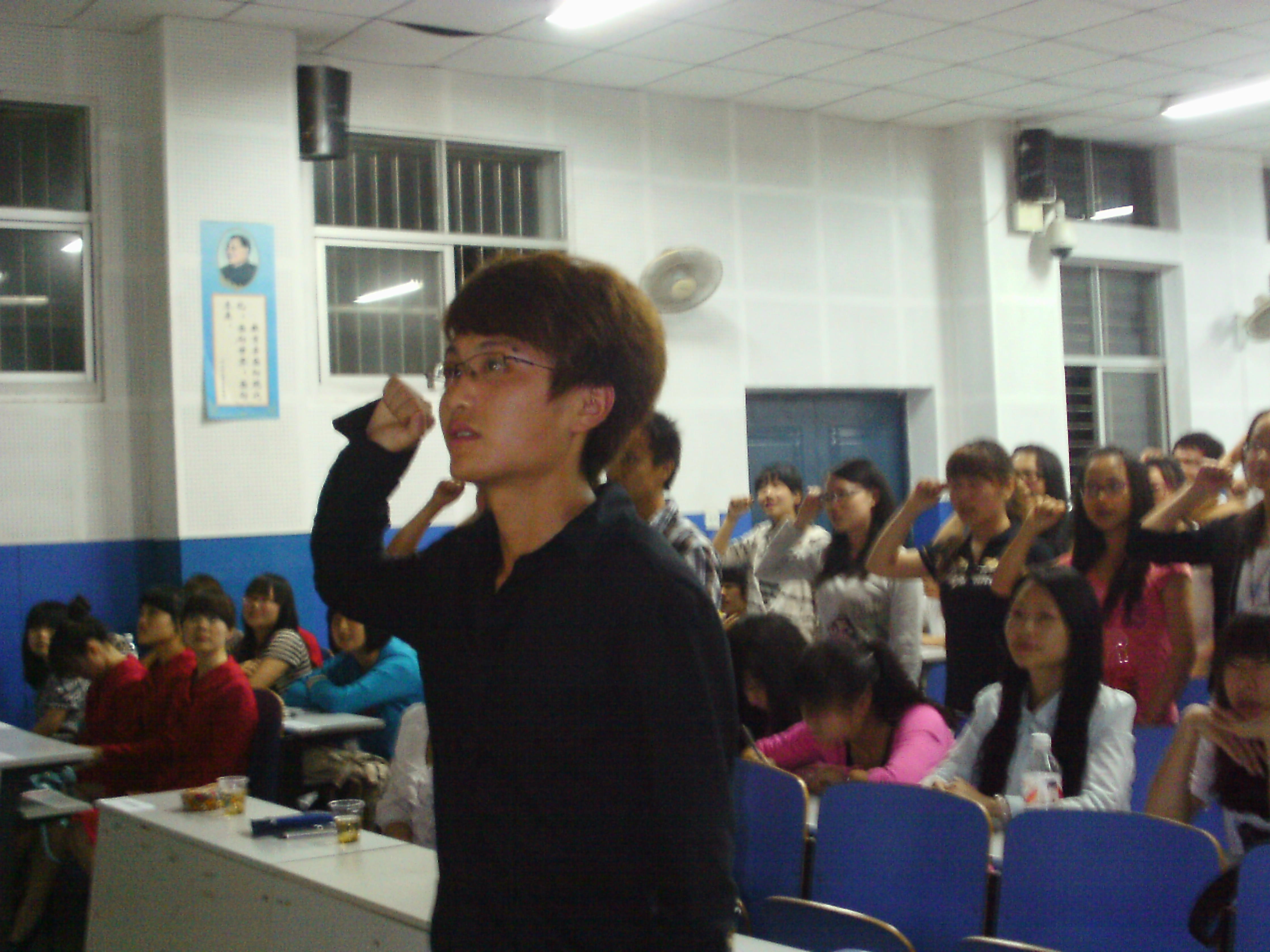 “我志愿加入中国共产党,拥护党的纲领,遵守党的章程……为共产主义奋斗终身!”这一句句激情饱满、热情澎湃的宣誓词回荡在整个教室。5月10日晚,教育学院2012年上半年新发展党员的宣誓大会在八教2—3教室进行。