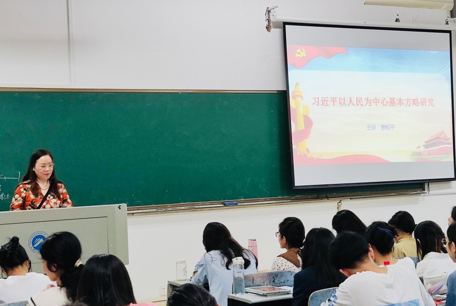 廖和平教授首先以“什么是‘为人民服务’”切入点,解读新征程的九个必须,结合历年党的主要会议报告,深入讲解人民至上的思想及其现实要求。从习近平以人民为中心基本方略的形成条件、基本特征、主要内容和重要意义四个方面进行阐释。她指出:党的根基在人民、血脉在人民、力量在人民;在新时代,进一步探讨人民至上的科学内涵以及弘扬为人民服务的精神是现实所需。