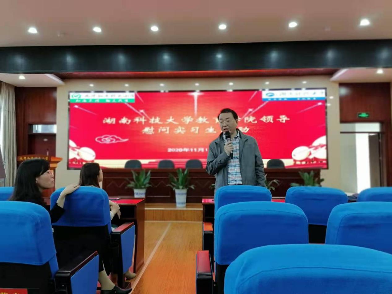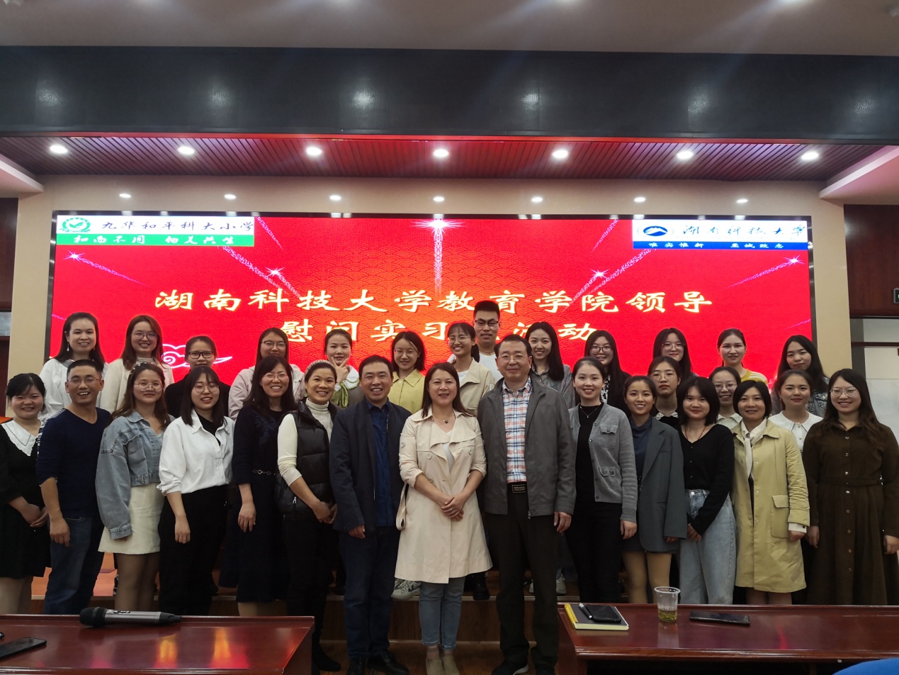 2020年11月18日下午,教育学院院长李海萍、小学教育系主任夏永庚、教务办主任周文杰来到九华和平科大小学慰问2017级本科实习生,活动九华和平科大小学综合楼五楼会议室进行。