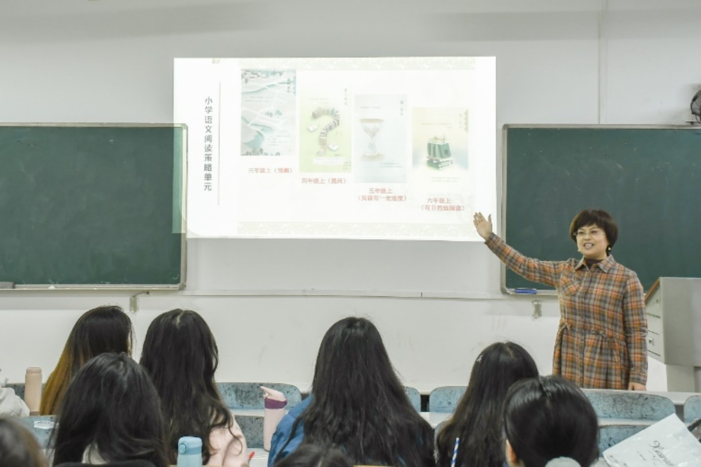 “在课堂上,我们要学会并善于向学生提问。”罗大红老师满怀热情地说道。在接下来的课堂上,她从什么是提问、为什么提问以及怎样提问三方面出发,加强现场同学们对提问策略教学的认识。同时,罗大红提出要把课堂交给学生,只有让学生参与进来才能实现既定的教学理念以及达到教学目标。