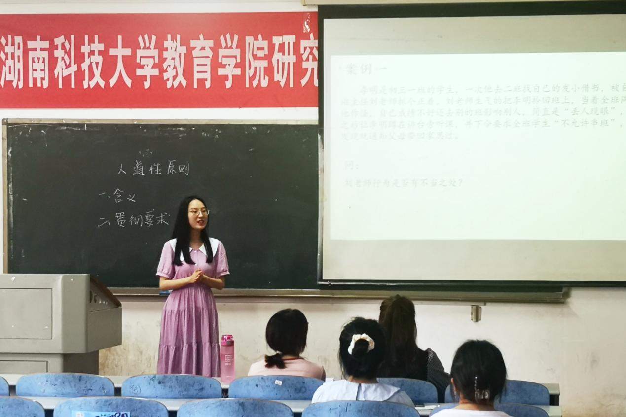 为进一步提升教育类研究生的教学技能、综合素质和就业竞争力,选拔优秀选手参加湖南科技大学研究生教学技能大赛决赛,5月9日上午,教育学院研究生教学技能大赛在第八教学楼102、103、104教室举行,来自教育学、教育管理、小学教育、心理健康教育、现代教育技术等专业的40名研究生参加了此次比赛。