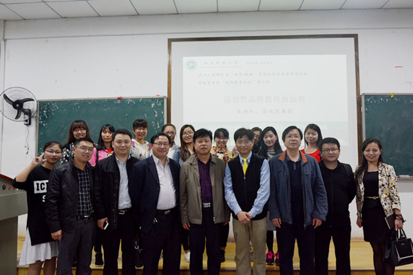 文韵飘香,道德共鉴。2016年4月24日晚,台湾屏东大学教育行政研究所教务长简成熙教授在我校为第十二届研究生“唯实·创新”学术论坛暨教育学院“明湖教育论坛”作了题为“道德暨品格教育面面观”的主题讲座。讲座由教育学院党委书记谭建平教授主持。湖南科技大学人事处处长陈春萍教授、教育学院副院长陈坤华教授,党委副书记王伟清教授,以及相关教师莅临现场。