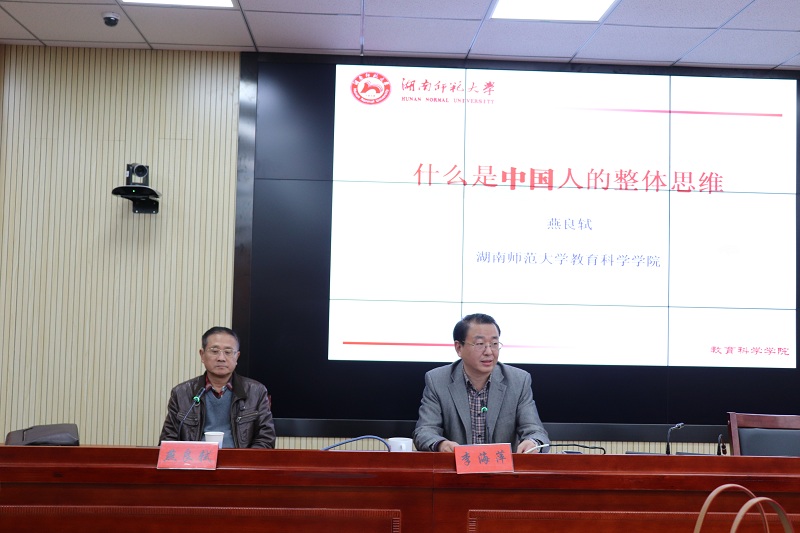2018年11月16日下午,湖南师范大学教育科学学院博士生导师燕良轼教授做客“明湖教育论坛”,为我院师生带来题为“什么是中国人的整体思维”的学术报告。报告会由教育学院院长李海萍主持。