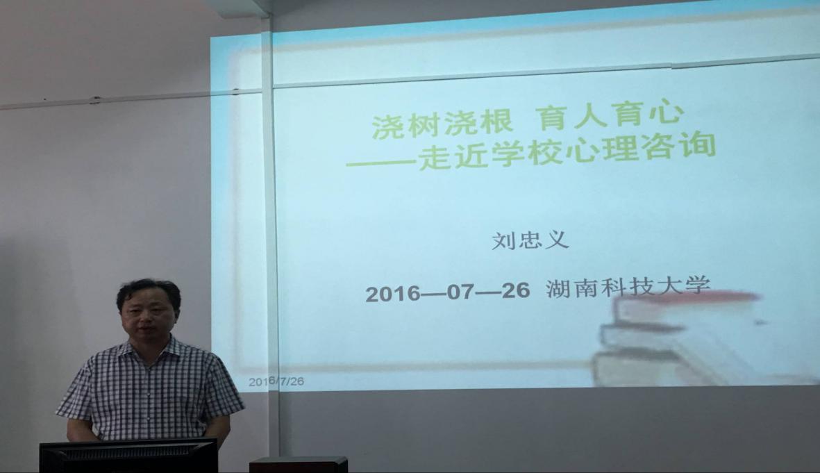 2016年7月26 日,湖南388vip太阳集团邀请常德市教育科学研究院规划与发展研究室主任、湖南科技大学兼职硕士生导师刘忠义为2014级在职教育硕士学员作了“学校心理健康教育”专题讲课。讲课由教育学院刘志军教授主持,全体心理健康教育方向学员在场聆听。