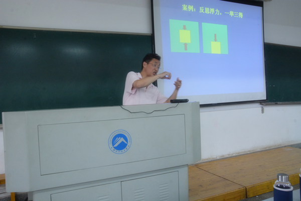 下午,湖南省特级教师、省“121人才专家”、“国培专家” 黄国雄教授作了题为“学习 研究 创新”的培训报告。黄教授以自身经历为引,讲述自己向书本学习,向生活学习,向同行学习,在讲学中学习的经历。黄教授用“重锤砸手”,“砸鸡蛋”,“立鸡蛋”等案例讲述自己在生活中是如何留心观察,认真思考,积极动手,举一反三,学习、运用和讲解物理知识。并且,黄教授也向学员讲述自己是如何在学习生活中做研究,创新,怎样从工作中挤出时间写论文,进行带外交流。从他的报告中学员看到了黄教授是如何一步步成长为一个特级教师、物理教学专家,也了解到了生活处处皆学问,只要用心你也可以成为专家。黄教授的报告使学员们受到了极大地鼓舞,激发了学员们积极学习的兴趣。