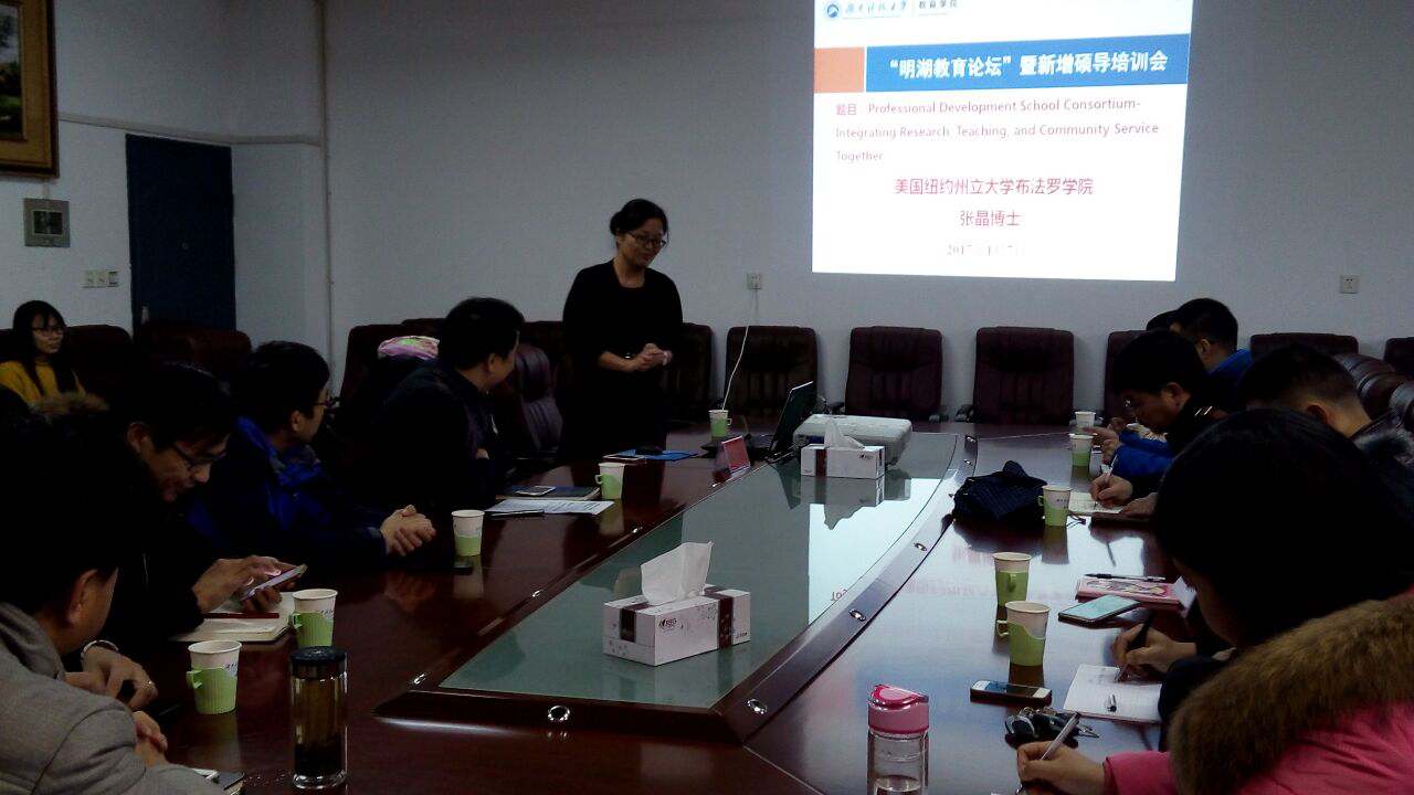 2017年1月7日下午,教育学院“明湖教育论坛”暨新增硕导培训会在八教203室举行,美国纽约州立大学布法罗学院张晶博士作了一场以《专业发展学校联盟:研究、教学和社区服务的整合(Professional Development School Consortium- Integrating Research, Teaching, and Community Service Together)”》 为主题的讲座。教育学院党委书记谭建平、新增硕士生导师、部分教师代表和研究生到场聆听了此次讲座。讲座由教育学院谭千保主持。