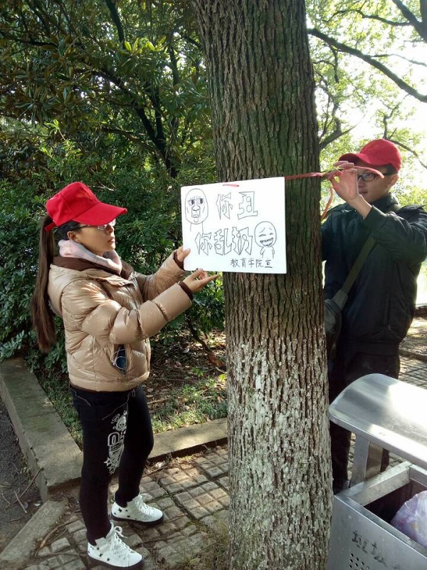 2016年11月26日教育学院青年志愿团第二和第五中队开展了挂标牌志愿活动。在活动之前,各队就在积极筹备制作标牌的活动。每位制作标牌的志愿者都在标牌创作上增添了新意,所选标语活泼生动,所绘画面形象且富有影响力。这些创意无限的标牌为志愿活动的进行增添了亮点。