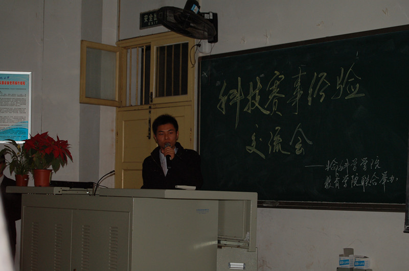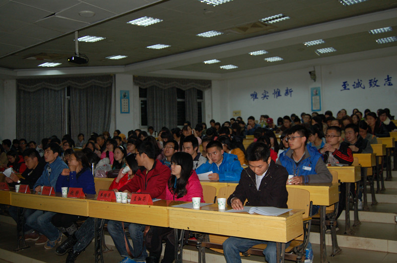 最后,龚勋为同学们讲述了自己的一些真实经历,他表明,自己的具体创新过程主要包含三点:创意、团队、执行。在作品的选题方面要新颖,成立团队要注重合作,优势互补,并且在理性的分析下,勇于坚持自己的想法。“最重要的东西都要回归到人本身,信念和坚持是最重要的”,他讲到,自己在大一时曾参加“挑战杯”校级决赛,却未能入围省赛,在大二时,却凭借着不被众多人看好的作品成功截获节能减排大赛全国决赛的二等奖,他风趣的为自己曾经的失败与坚持写下一句话:“执着的人必苦于其执着,也必乐于其执着”这不禁让在场的同学大为敬佩,纷纷鼓起掌来,而正是这样的坚持和执着,让他在科技创新这条路上一路走下去。