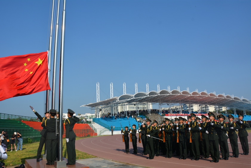伴随着国歌声响起,五星红旗在风中飘扬,庆国庆、迎校庆,在场新生高声齐呼“祝祖国繁荣昌盛,祝科大越来越好!”紧接着,开始进行军训汇报表演,由军训团教官方阵队打头阵,来自各个学院的方阵队迈着整齐的步伐走向主席台。“名为希望,身似尖钢。看我教院,横扫八荒!”,伴随着响亮的口号声,来自我院方阵队昂首挺胸,步伐坚定,展现出教院学子的恢弘气势。在接下来的拳术表演和战术表演中,身着军装的同学们英姿飒爽,气势如虹,令人叫好连连。