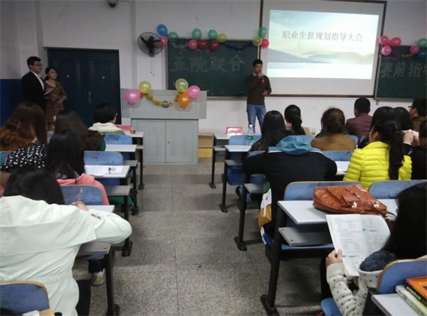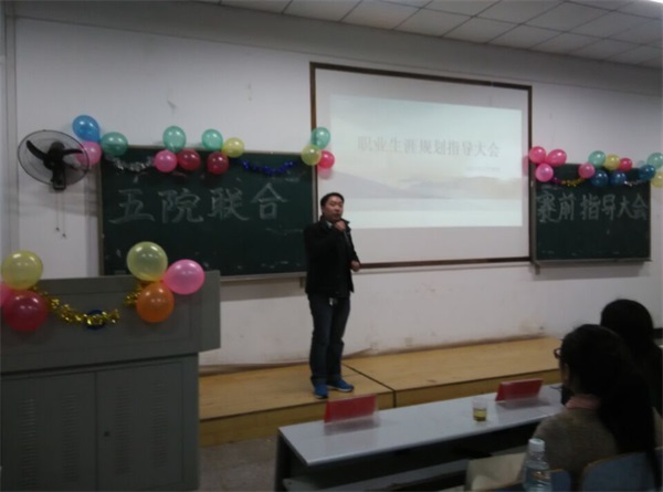 2015年3月20日晚19时整,教育学院、法学院、物电学院、外国语学院、生命科学学院五院联合职业规划赛前指导大会如期开场。就业协会会长胡磊、校就业服务部部长李涛、往届获奖选手陆子龙、张彤、李润洲、孙雅晴应邀作为莅临嘉宾指导经验。