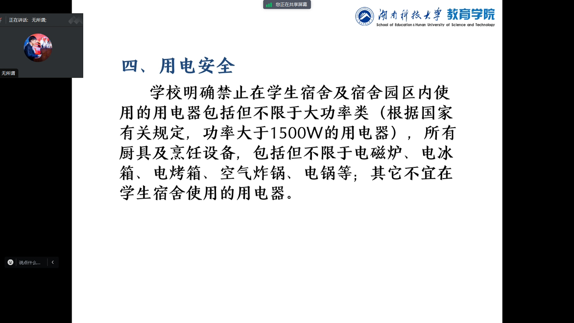 会上,文红梅副书记强调了《湖南科技大学学生违纪处理办法》和《湖南科技大学校园摩托车、电动自行车 及各类非车辆代步工具管理办法》等相关规定,教育大家遵守交通管理相关规定,增强安全意识,杜绝事故发生;同时,要求同学们诚信应考,杜绝考场违规违纪行为,以优秀成绩和优良表现迎接春节的到来。她还要求寝室长和各班学委切实担起责任,维护好教育学院正常生活秩序和学习纪律,争创优秀寝室和班级。
