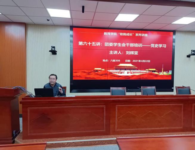 为了促进团委学生会干部更好地了解党内历史,增强道德修养,改进工作作风,从历史中汲取力量,促进学生全面成长,教育学院于4月22日19:30在第八教学楼308会议室开展了以党史学习为主题的团委学生会干部培训会。会议由党委副书记刘辉亚主讲,第二十二届团委学生会干部到场学习。