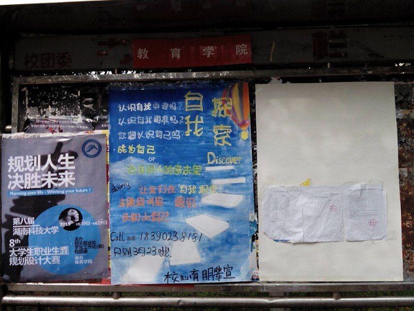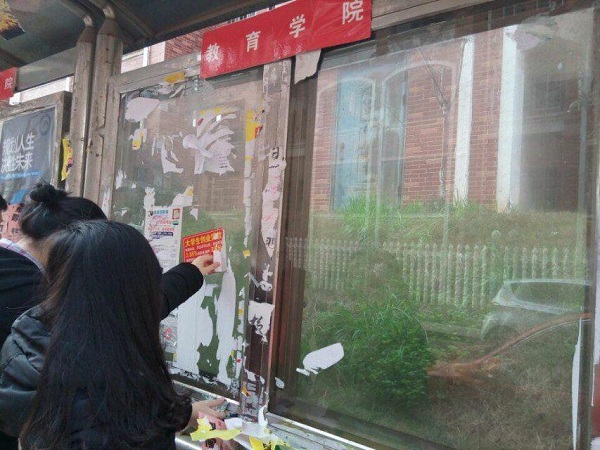 3月22日早上8:00,由教育学院青年志愿团开展的“校园整洁从我行”活动开始了。这次活动的地点是校内。新的学期开始了,漫天的广告打响了,宣传栏也没能逃过一劫。为了让宣传栏恢复它往日的容貌,清理宣传栏的活动如火如荼地进行了。