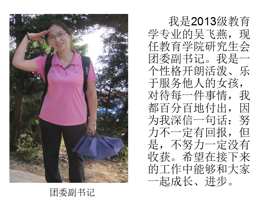 2、为研究生会其他部门举办的各种活动做好内外宣传工作,如现场拍照、撰写新闻稿,并将新闻稿和图片上传至教育学院或研究生学院网站进行报道。积极配合其他部门活动的开展,成为他们的坚强后盾。