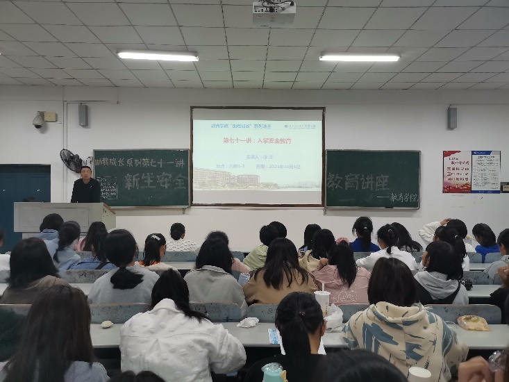 为使2021级新生能更好地适应大学生活,明确校纪校规,时刻注意自身安全,10月8日下午7:00,教育学院在第八教学楼4-3教室开展了“助我成长”系列讲座第七十一讲:入学安全教育。本次讲座由教育学院学工办主任李涛主讲,全体21级新生参与。