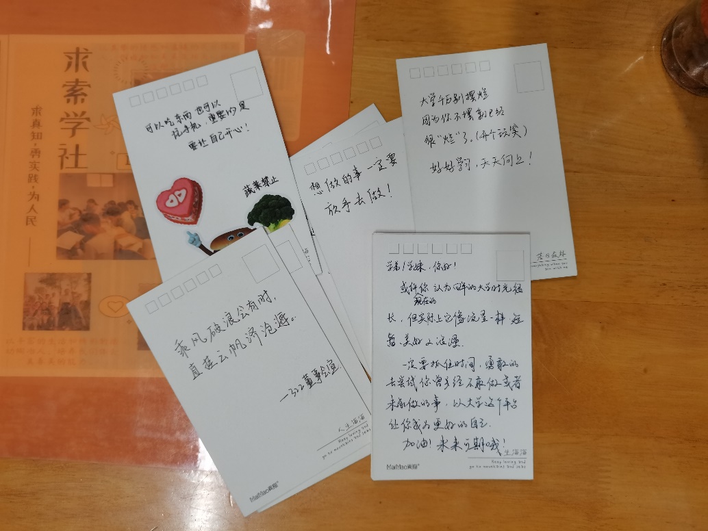 为促进毕业生与学弟学妹们的经验交流, 6月7号,校友资源部的成员们来到了毕业生寝室,邀请各位学长学姐写下“爱的寄语”。通过寄语卡,学长学姐向同学们传授了学习、考研、应聘等多方面经验,同时表达了对学弟学妹们的真诚祝福。一张张爱心卡片上是学长学姐们在这四年间的亲身经历与感悟,他们将自己宝贵的经验倾囊相授,为同学们解答疑惑,点明了前进方向。