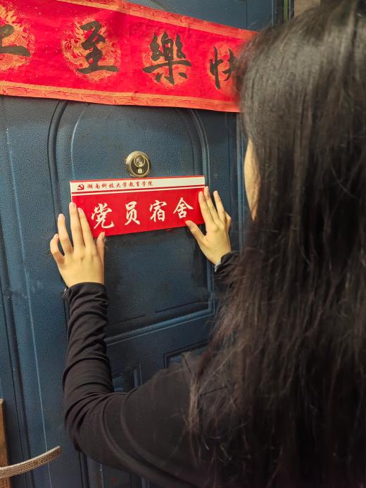 学生党员代表余新宣读《宿舍文明公约》,学生党员签订《教育学院学生党员〈宿舍文明公约承诺书〉》,文红梅为学生党员宿舍授牌。