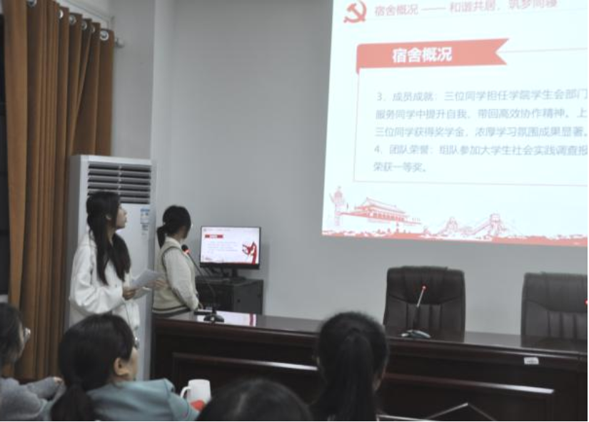 学生党员代表王晓晶、雷佳欣分享优秀宿舍文化建设心得。她们表示宿舍是第二家园,“党员宿舍”门牌时刻提醒自己牢记党员身份,将继续发扬优秀宿舍优良传统,以身作则建设好党员宿舍,由点带面促进整体精神风貌建设。