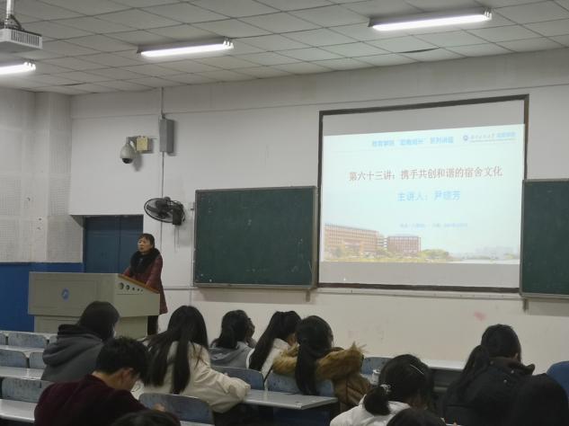 宿舍是同学们的家,和谐温馨靠大家。为了让教育学院广大学子共创和谐的宿舍文化,让大家都有一个温馨的家。3月9日下午5点,在第八教学楼1-3教室召开了“携手共创和谐的宿舍文化”的专题讲座。主讲人为学工办尹琼芳老师,18、19、20级全体寝室长到场聆听。