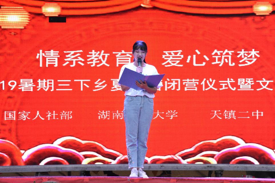 本次晚会共分为结营仪式和文艺汇演两部分。结营仪式上,学生代表及家长代表先后发言,分享了在此次夏令营活动中的收获与思想觉悟,对全体教员认真践行湖南科大‘唯新唯实 至诚致志’的校训和‘用最初的心 做最远的事’的志愿服务宗旨,给孩子们带来知识和成长、欢笑和希望表示衷心的感谢。