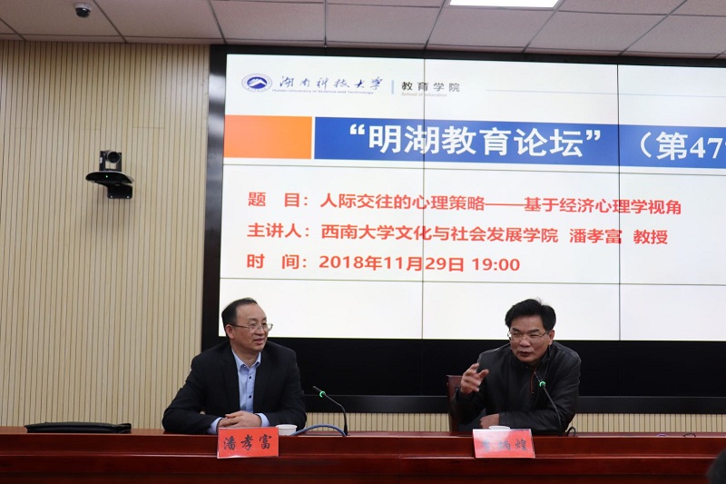 2018年11月29日晚上,西南大学文化与社会发展学院院长潘孝富教授做客“明湖教育论坛”,为我院师生带来题为“人际交往的心理策略——基于经济心理学视角”的学术报告。报告会由教育学院党委书记李炳煌主持。