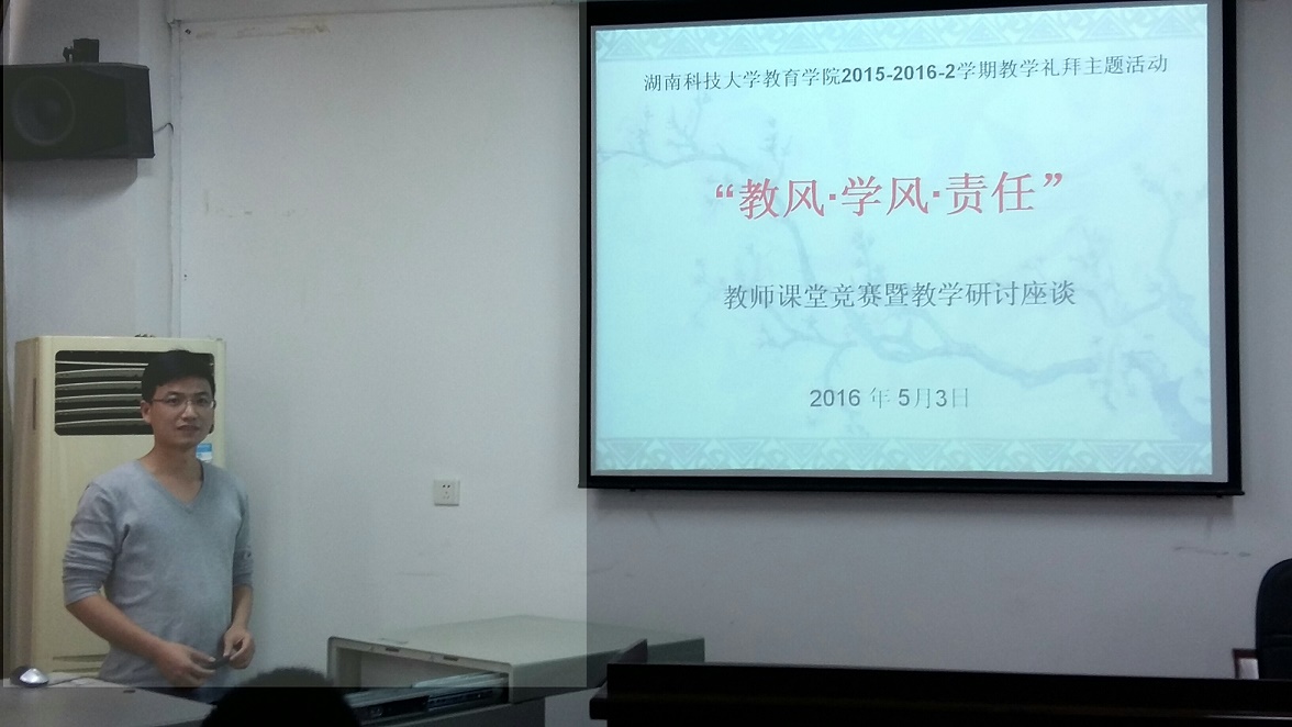 本次大赛基本按照省教育厅首届教师课堂竞赛规则进行,旨在更好地促进教师之间的交流和学习。每位教师提前准备1课时的教学设计和授课课件,并分别进行15分钟的课堂展示,王贤文、张晓报、刘旭、夏永庚等四位教师先后对自己的课程教学进行了展示。王贤文老师主要介绍了ppt强大的交互功能,并逐个演示超链接、触发器等制作及其于教学课件的完美结合方法;张晓报老师由《论语》中的经典引出“学习迁移”这一主题,并通过生动的实例介绍学习迁移的内涵以及分类,给我们以很大的启发;刘旭老师主要为我们讲述了《普通心理学》中的“知觉”的概念,并对我们日常生活中的反应进行科学分析,在场的老师都很投入;夏永庚老师则带我们重回两宋时期,领略了闻名至今的六大书院,并介绍两宋时期的教育概况,其生动的讲解让我们仿佛穿越至充满书卷气息的两宋书院。