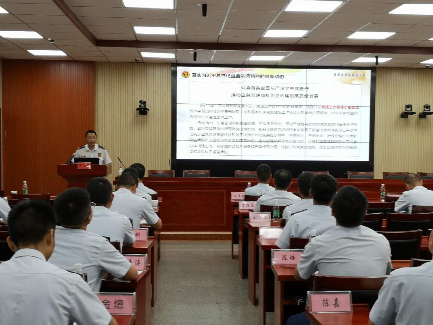 7月24日下午由我院承办的湘潭市消防救援支队2020年干部政治轮训班圆满结业。湘潭市消防救援支队党委书记、政治委员毕良之党委委员、副支队长徐海斌,院长李海萍院党委书记李炳煌参加结业典礼由湘潭市消防救援支队党委委员、副支队长杨鑫主持。院长李海萍同志宣布湘潭市消防救援支队2020年干部政治轮训班101位结业人员名单