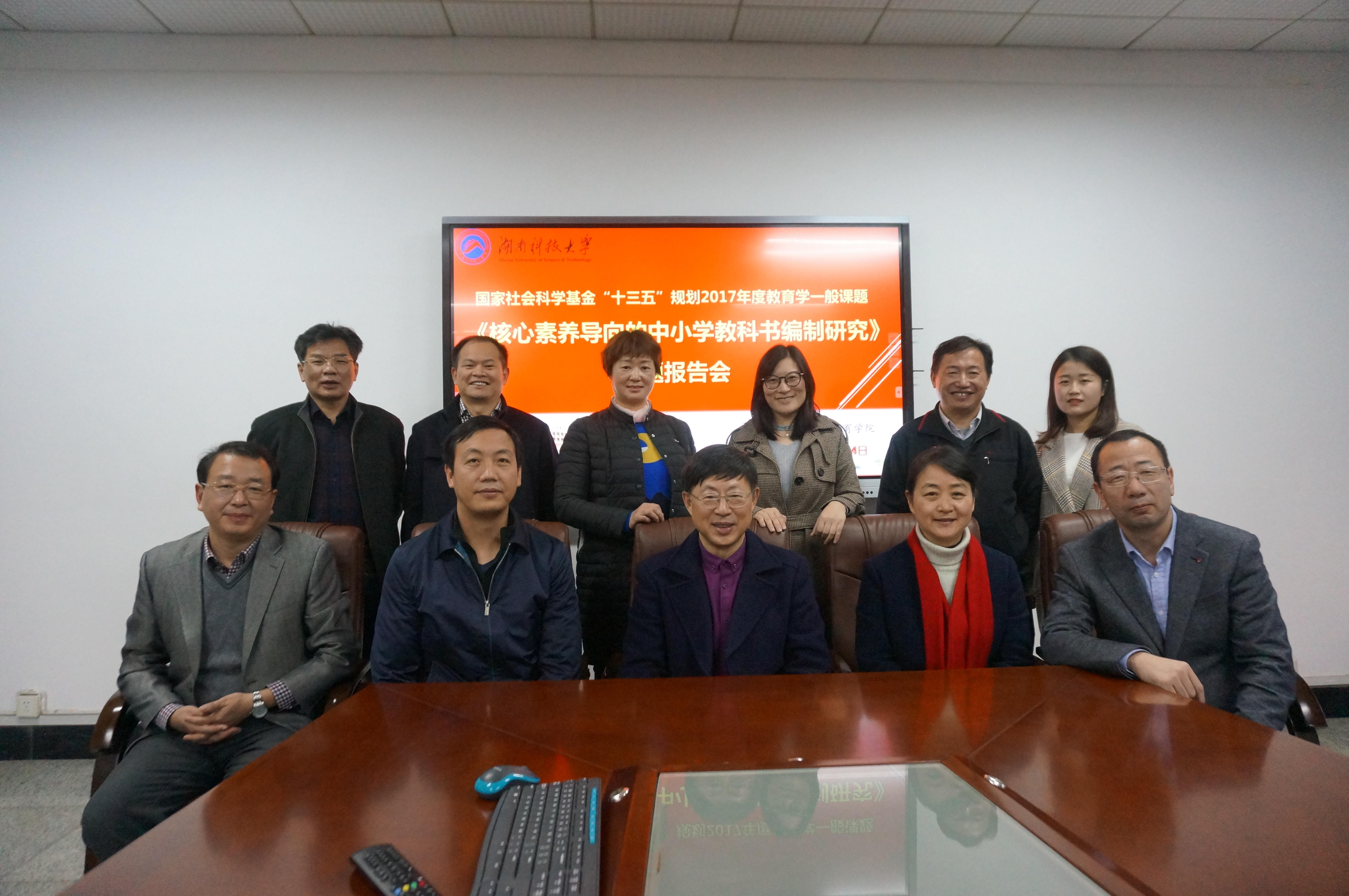 11月24日下午,我院小学教育系朱华副教授主持的国家社会科学基金“十三五”规划2017年度教育学一般课题《核心素养导向的中小学教科书编制研究》开题报告会在第八教学楼208会议室举行。首都师范大学特聘教授、我校“湘江学者”特聘教授石鸥教授,首都师范大学教育学院张增田教授,湖南师范大学教育科学学院辛继湘教授及我院院长李海萍教授出席。开题报告会由我校纪委书记刘宇文教授主持。