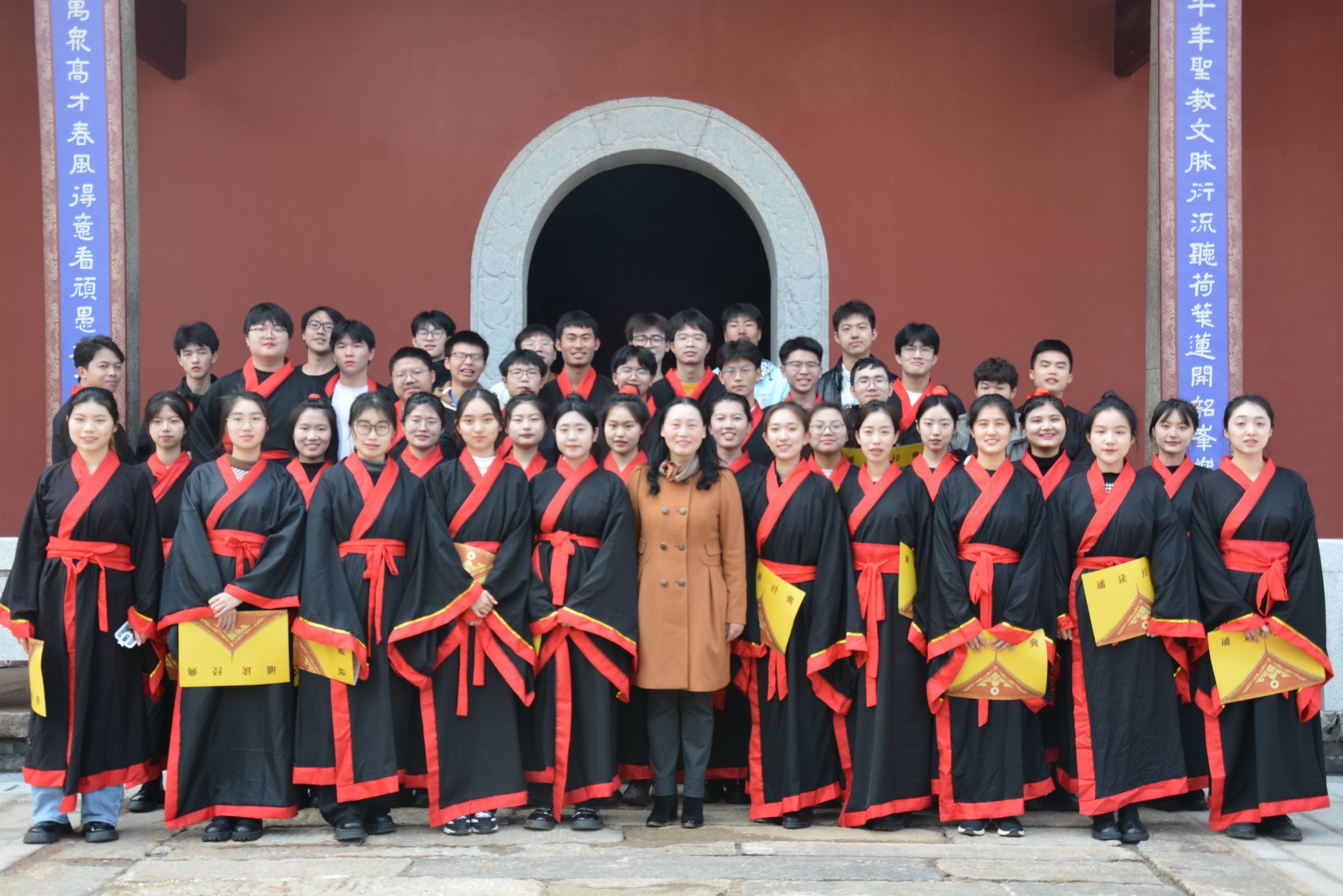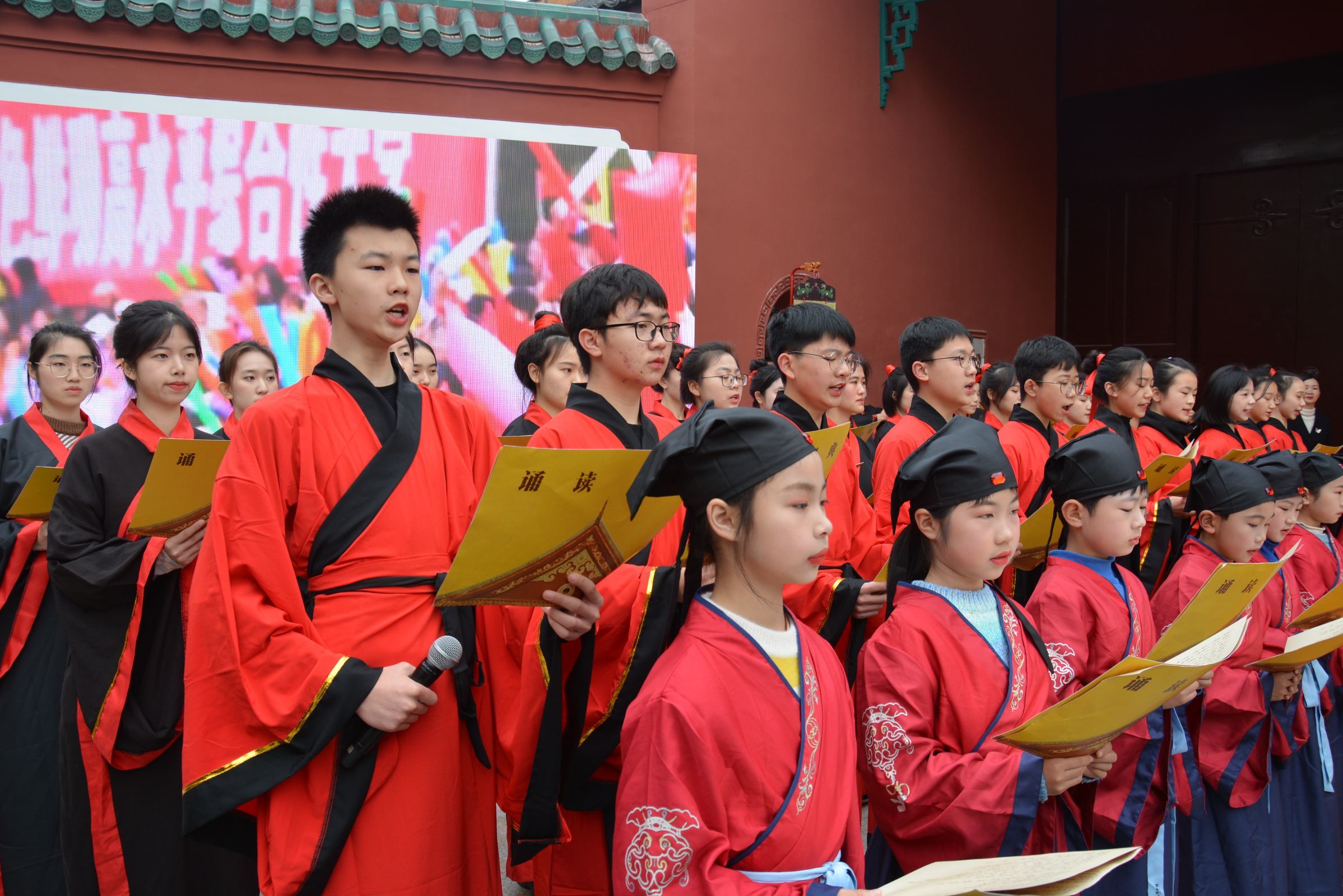 诵读者庄严肃穆站立在大成殿前