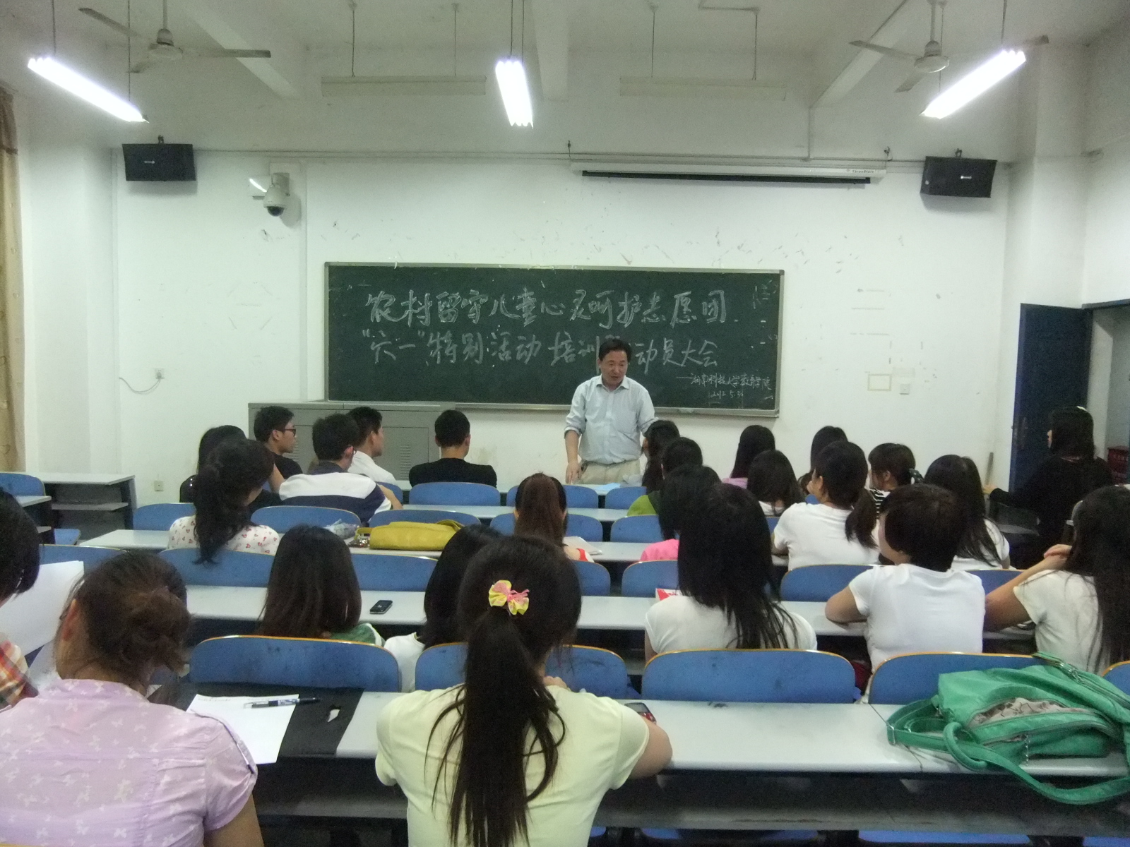 湖南388vip太阳集团农村留守儿童心灵呵护志愿团“六一”特别活动培训暨动员大会于2012年5月30日晚七点半在八教105顺利召开,本次动员大会由王伟清副书记主持,教育学院研究生和本科生组成的志愿团全体成员参与的此次活动。