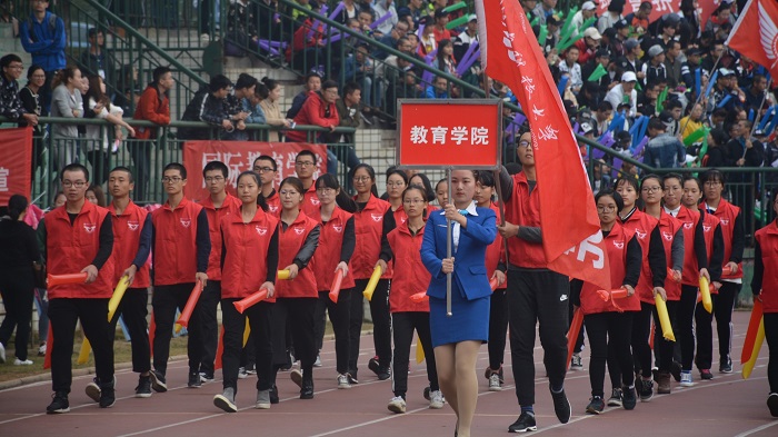 彩旗飘飘,身姿挺拔,步伐整齐,服装统一,彩旗队、鲜花队等一一走过主席台。随后教育学院方阵队正式入场,一身黑色着装深沉帅气、红色马甲引人注目,他们手举打击棒,高呼着“学高为师,身正为范,教院骄子,勇争桂冠”的口号。响彻云霄的声音和整齐划一的动作赢得了全校学生的目光,鲜衣怒马,少年意气。紧随其后的是教育学院的教师团队,青春的着装向同学展现出了学院教师们永不过时的思想,出来半生,他们仍是少年。
