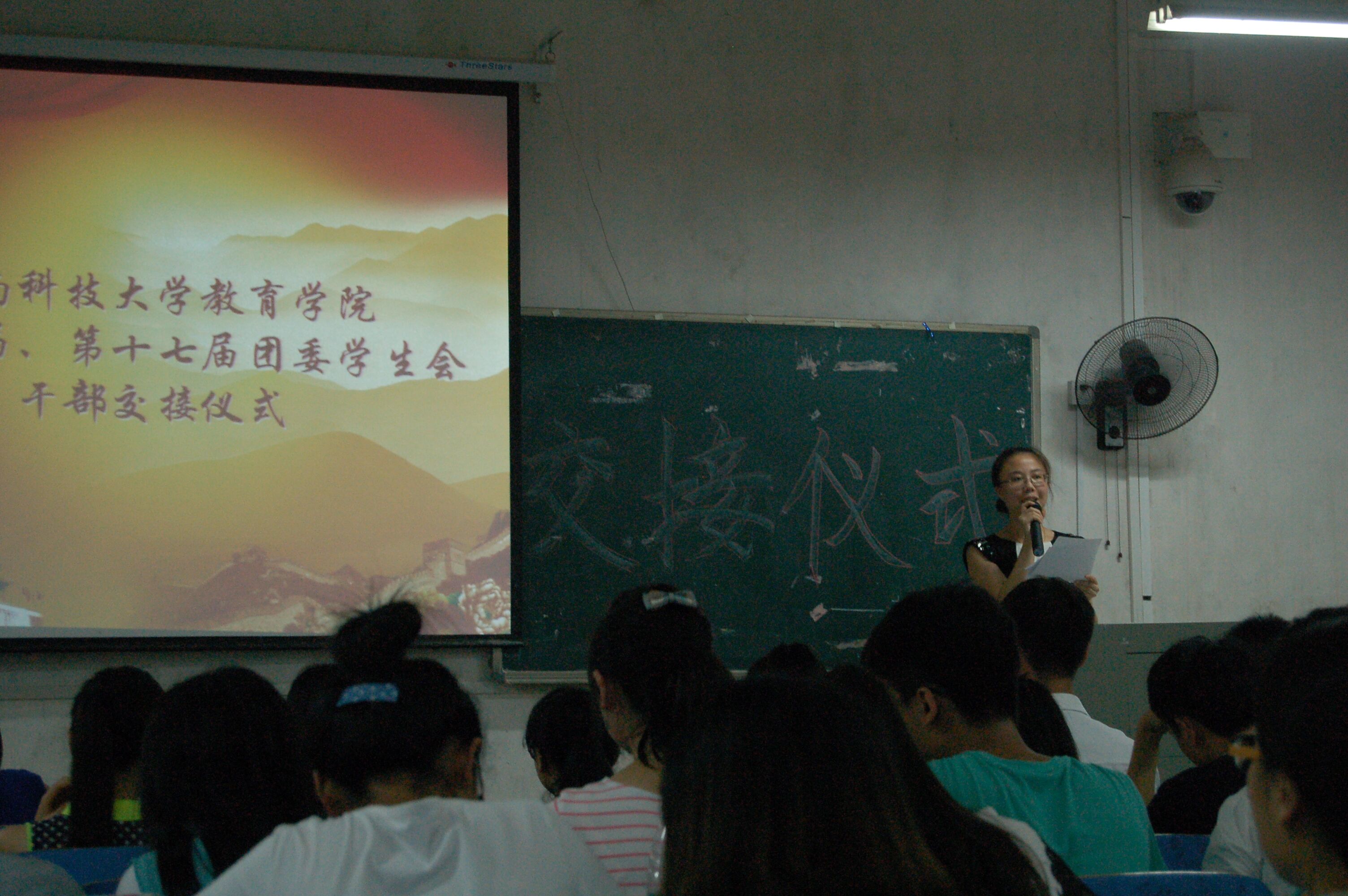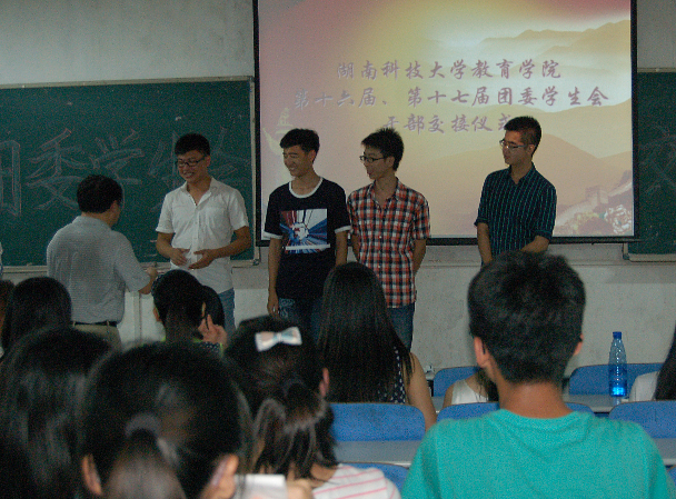 2015年6月29日晚19时30分,教育学院的第十六届、第十七届团委学生会干部交接仪式八教1-6顺利拉开序幕。教育学院副书记王伟清以及学工办尹琼芳老师、练素华老师、李涛老师和胡银华老师参加了本次仪式,另外,第十六届团委学生会与第十七届团委学生会成员也悉数参与了此次交接仪式。
