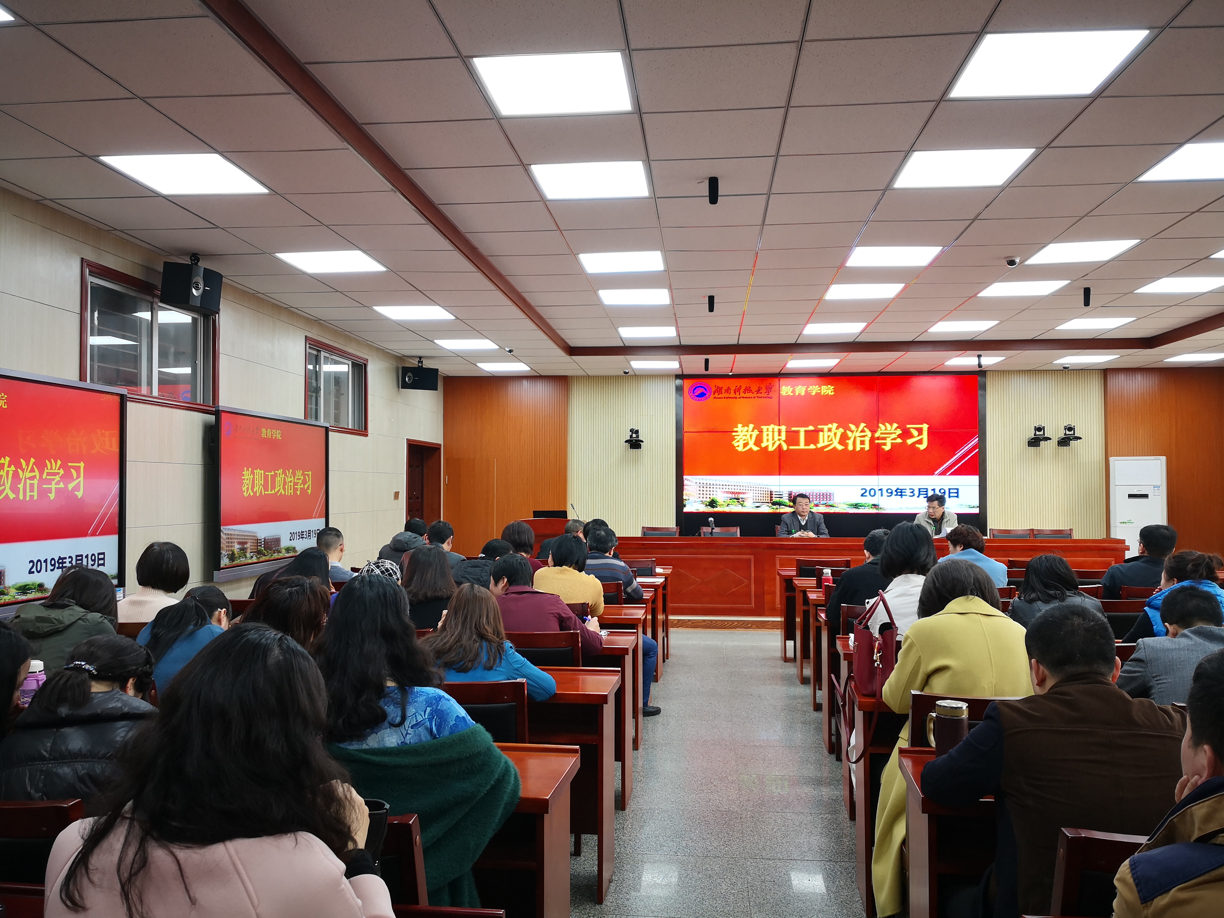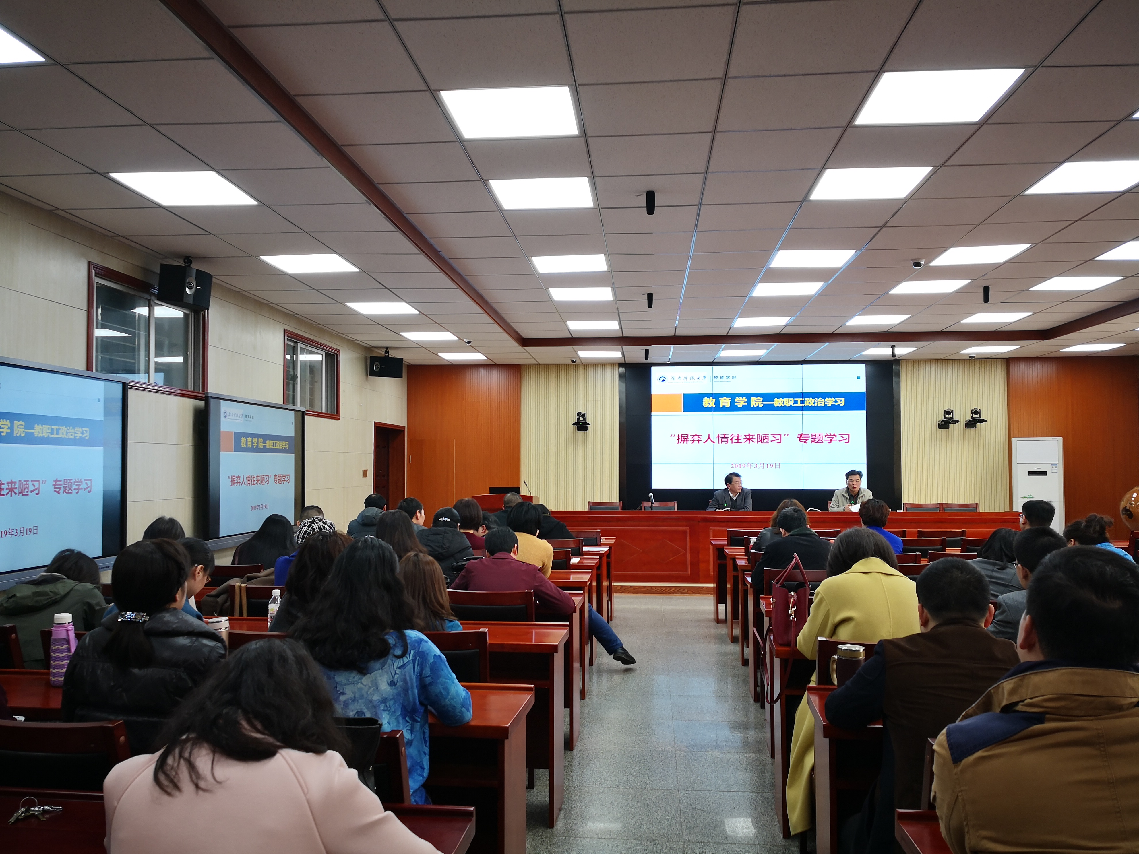 2019年3月19日下午,教育学院组织全体教职工在八教308会议室开展“摒弃人情往来陋习”专题学习,集中学习传达《关于在全校开展文明节俭操办婚丧喜庆事宜的工作方案》(科大党发【2018】36号)文件精神。会议由院党委书记李炳煌主持。