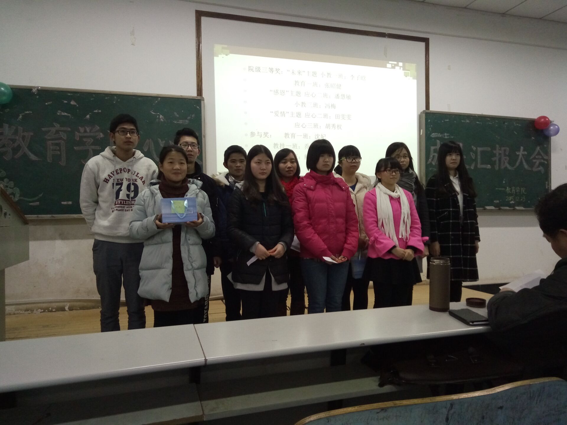 2015年12月23日16点教育学院于第八教学楼3-3教室举行教育学院心灵成果汇报大会,与会嘉宾有教育学院党委副书记王伟清,学工办辅导员老师练素华、胡银华、滕茜茜以及学生会副主席肖雨薇、杨柠遥、张丹。15级各班的代表皆悉到场。