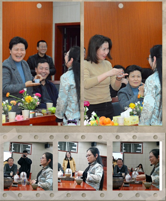 插花环节结束后,由我院陈俊兰老师给大家讲授了茶道知识,并进行优雅的茶艺表演。现场邀请男嘉宾刘宇文进行茶艺礼仪示范互动,所有的嘉宾在这春暖花开时节,伴着古典音乐,欣赏着活动现场大屏幕滚动展出的我院女老师们业余兴趣爱好创作的字画、篆刻、摄影以及盆栽绿植作品,大家围坐一起,闻香品茗。鲜花养眼、清茶养神、德艺养心、关爱暖心,娇艳的鲜花映着老师们脸上灿烂的笑容,扑鼻的花香衬托出老师们优雅的气质,整场活动温馨而雅致,“咔擦”一声,定格节日美好。