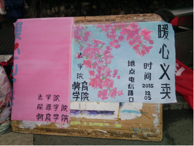 今天的天气跟志愿者的心一样明朗,雨也许因为他们的热情而怯场,也许懂得了退让,续雨过后,天气无雨,虽颇气寒,但现场的气氛却渐次点燃!由于天气原因,原定于12月5日的爱心义卖在12月6日展开,在电信路口,由教育学院联合能源学院、法学院举办的暖心义卖正有条不紊地进行着。