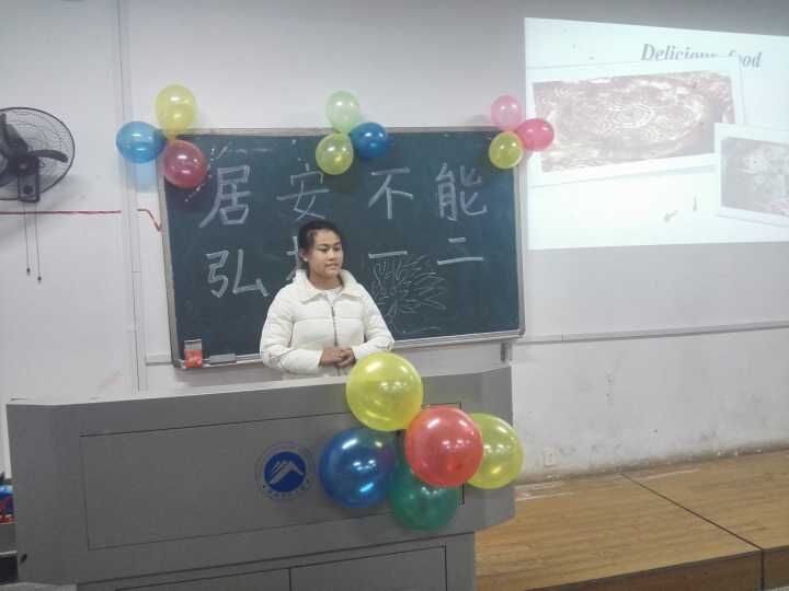 活动第一项便是激烈的踩气球大赛,现场气氛很是活跃,大家积极性都很高。第二项是英语演讲比赛,是此次活动的重点内容。由班上的几位同学以自己所做的ppt做辅助,进行英语演讲,表达自己的梦想与爱国热情。谷娟对他们所做的演讲一一做了点评并给予鼓励,还给大家分享了一些学习英语的技巧,推荐了一些不错的英语学习软件。当小品活动正在进行时,教育学院的王伟清副书记来到现场,王伟清副书记一脸和蔼的笑容,并摆手示意小品继续。小品表演完毕,大家对王伟清副书记热烈鼓掌以示欢迎。时间过得飞快,转眼活动就接近了尾声,王伟清副书记向大家表示祝贺与鼓励,看得出,他对此次活动很是满意。他说,他读初中,高中以及大学都不怎么会弄这方面的事,觉得同学们很厉害,很棒。要同学们以后要认真学习,好好发展。王书记如同一位和蔼的邻家伯伯,和同学们聊了很多生活上,学习上的相关事物,语言间充满对同学们的关心。他希望教育学院以后可以多举办一些类似的活动,增强同学之间的交流,锻炼表达能力,带动学院的学习氛围。