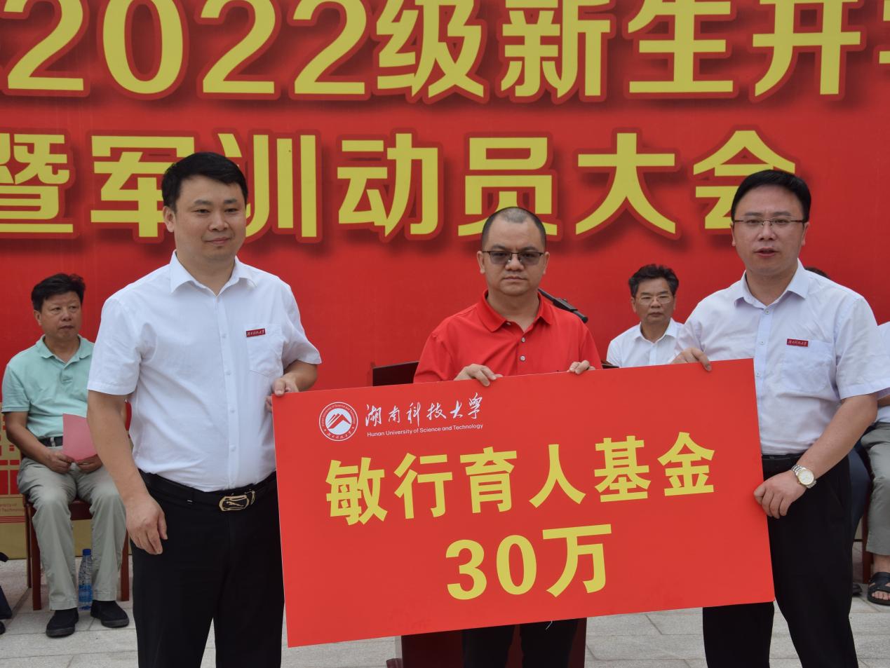 在本次开学典礼上,湖南科技大学广东校友会会长彭德祥与校纪委书记郭时印、教育学院院长谭千保共同启动由教育技术学校友发起并率先捐赠的30万+“敏行育人基金”,以用于奖励或资助教育学院在校生创新创业等各类竞赛。