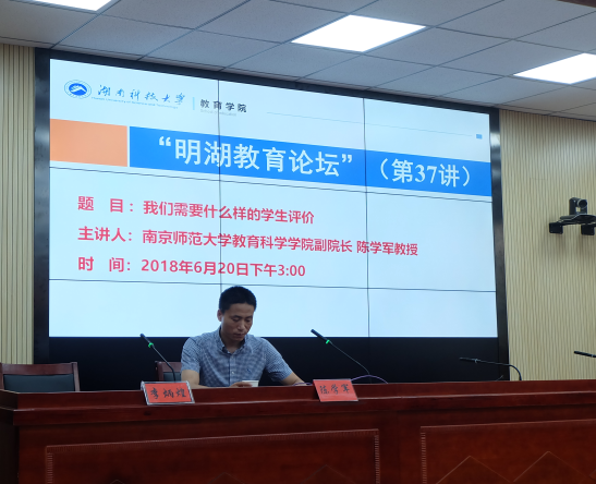 2018年6月20日下午,南京师范大学教育科学学院副院长陈学军教授做客“明湖教育论坛”,为我院师生带来了主题为“我们需要什么样的学生评价”的学术讲座。教育学院教师代表、研究生与本科生代表到场聆听。讲座由教育学院党委书记李炳煌主持。