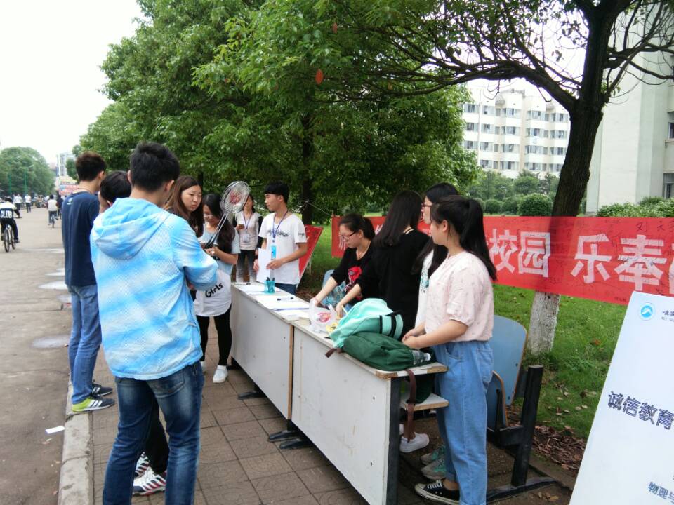 “讲诚信树新风建和谐校园,乐奉献知感恩筑正气中国”。 2016年5月30日,教育学院、数学与计算科学学院和外国语学院在北校七区联合开展了诚信宣传展板活动。三个学院的负责人早早拉起了横幅,将宣传展板,展台摆好,准备好诚信讲解内容和诚信快答问题,开始一天的宣传活动。