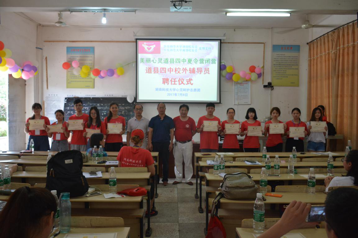 汇报会上,王伟清教授指出,本次活动旨在通过志愿队成员与被试对象之间的互动与交流,了解被试者的心理动态,并以此引导被试对象的家长、老师、同辈群体如何帮助被试者心克服心理障碍,促进气心理健康发展和品德的发展。同时,志愿团将会给每位重点呵护对象建档,志愿队成员将通过网络、书信等方式对重点呵护对象进行后续跟踪,从本质上帮助重点呵护对象。随后,举行了“道县四中校外心理辅导员聘任仪式”,并举行了“长期合作签约仪式”。