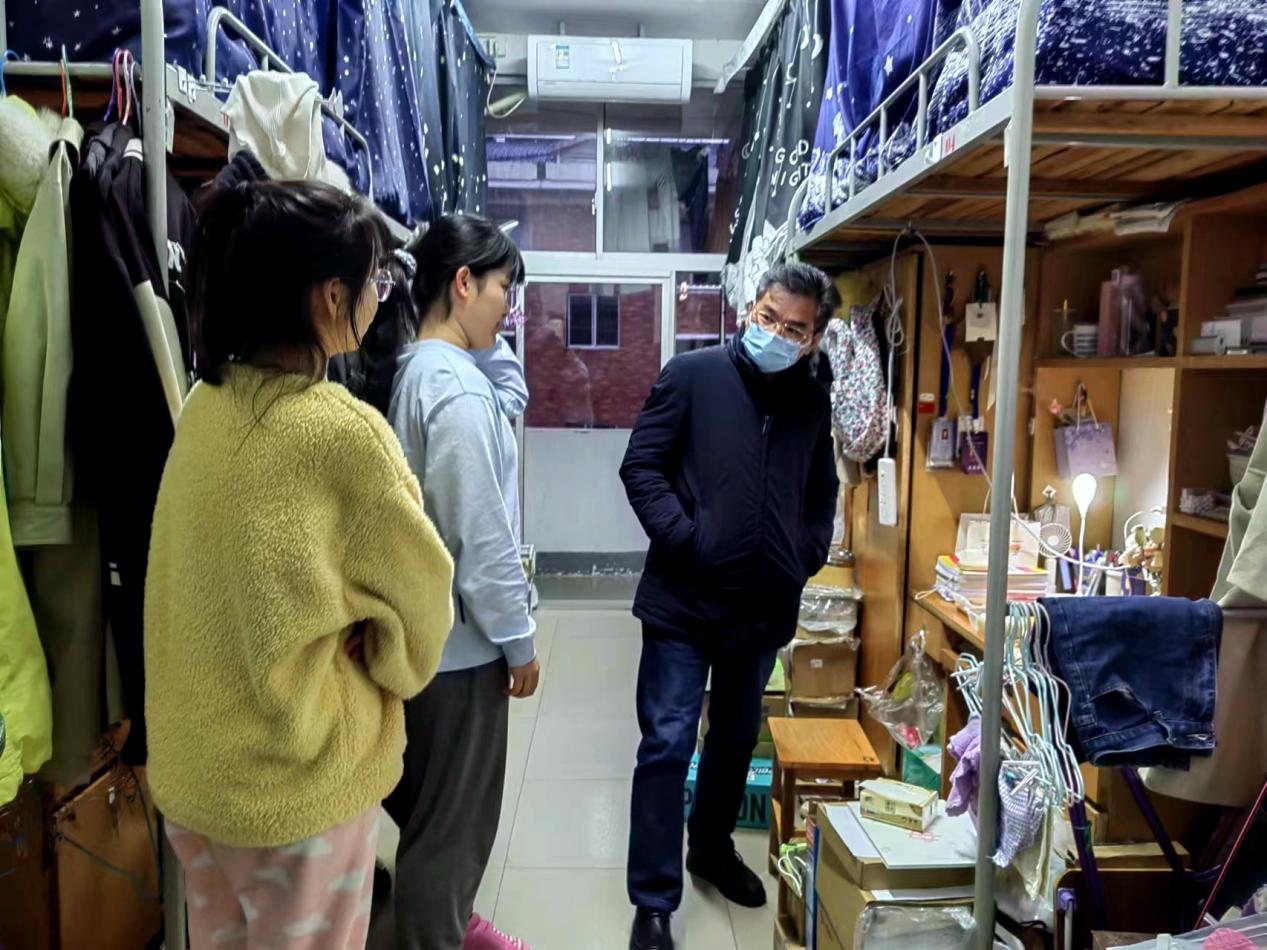 在七区学生宿舍,谭千保提醒同学们要尽早作出规划,提高学习效率,同时也要注意做好寝室内务;在八区毕业生宿舍,李炳煌详细了解了同学们的目前状态,鼓励考研的同学继续坚持,提醒正在找工作的同学注意做好疫情防护;在五区学生宿舍,陈京军提醒同学们要注意保暖,在学习之余可以多与同学和老师们交流;在六区学生宿舍,刘婕和张进良仔细了解了大一年级学生当前的学习和生活状况,鼓励同学们营造良好的宿舍氛围。此外,老师们还与同学们强调,杜绝在宿舍使用大功率、给电动车充电等行为,还提醒同学们非必要不出校,离开寝室时锁好门窗,以保证自己的生命财产安全。