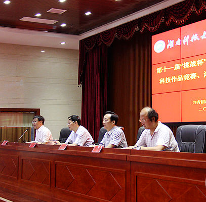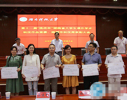 2015年6月9日晚,我校第十一届“挑战杯”湖南省大学生课外学术科技作品竞赛暨湘潭市科技周表彰大会在综合楼五楼报告厅举行。校党委副书记朱川曲出席,相关单位负责人以及获奖集体和个人参加会议。教育学院王伟清书记和肖善芳老师指导、高任连负责的《针对留守儿童心灵危机之大学生德育实践模式的研究与实践》项目其他参与者谭玉等也参加了本次表彰大会。