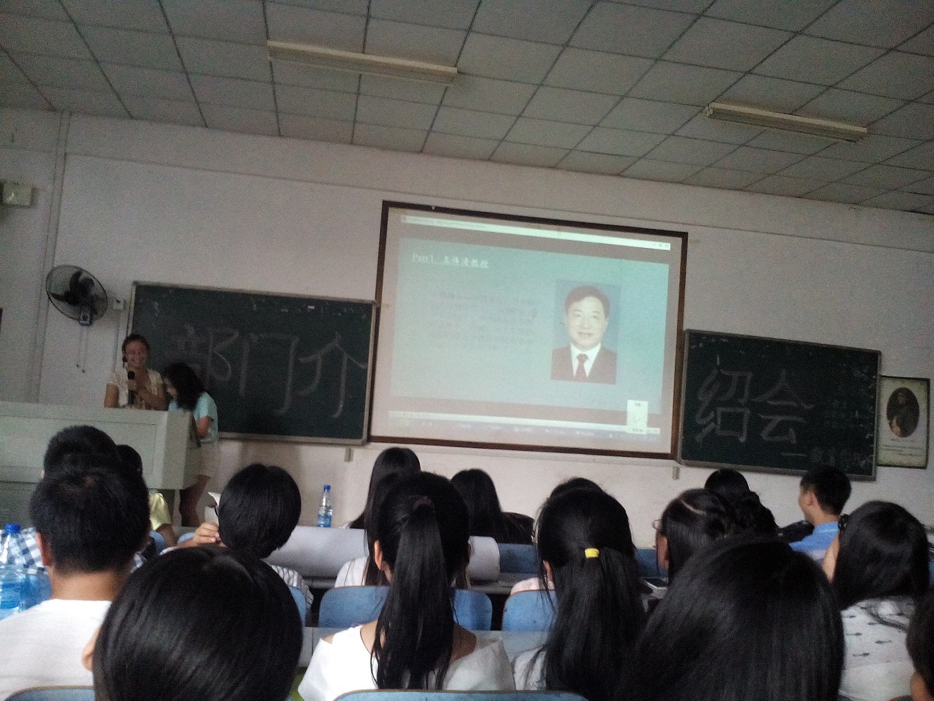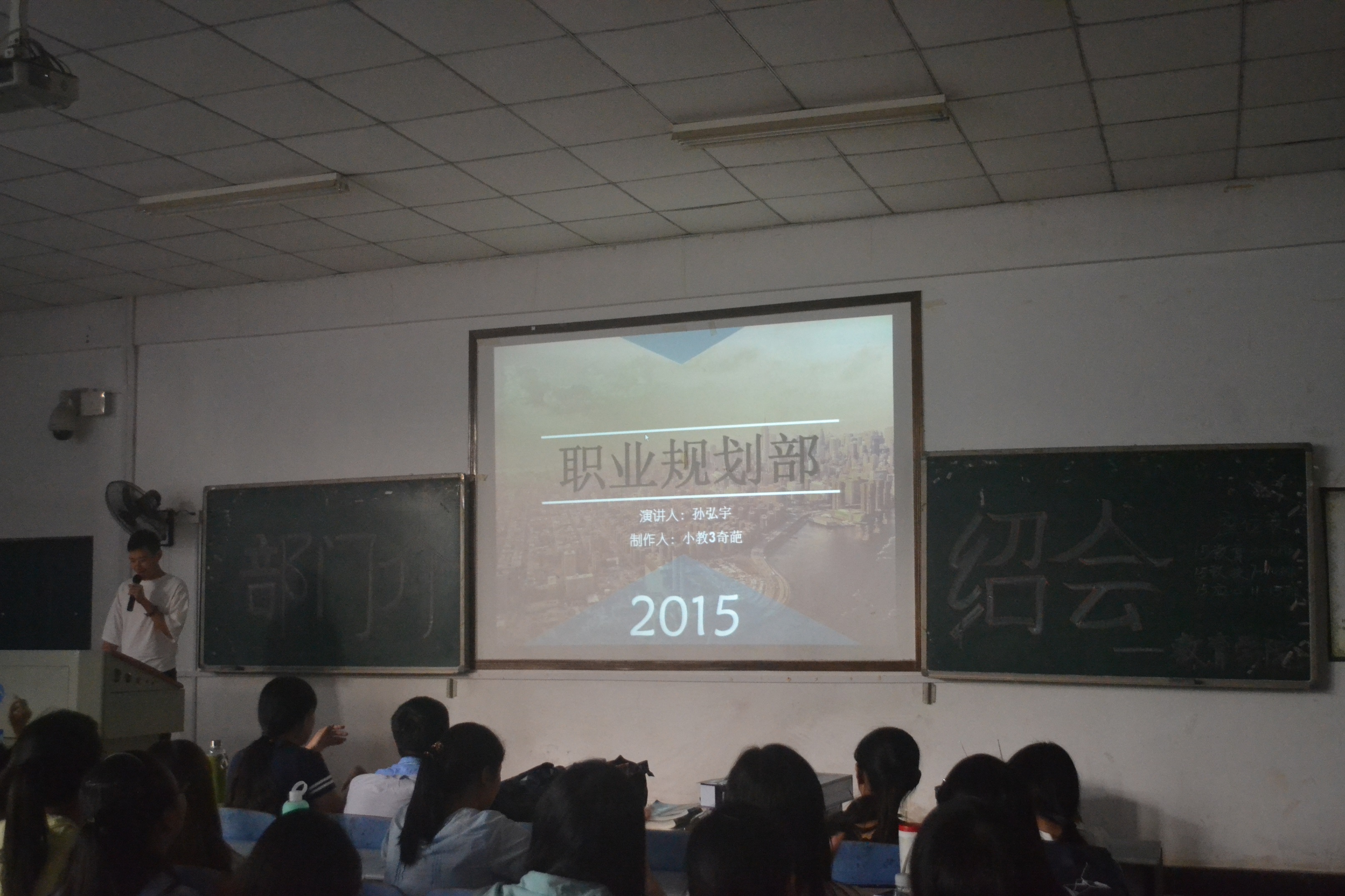 15级新生依序坐定,首发由学生会主席张彤进行第十七届主席团简介,PPT进行结构拆解,内容介绍学工办老师、主席团成员和各部门概况,强调新生选择的“归属感”。而后的党建会在多媒体展示中也在职能组成和成员介绍上进行多面普入。19个部门的轮序演示中,综合管理部以视屏和动画效果解析部门工作职能、日常管理和招新计划;组织考核部以技能型多媒体展示凸显部门优势和工作成果;纪检宿管部大呼“等到你,再出发”,几届“男神”夺人眼球;危机干预部作为“贴心小卫士”在创新,ppt效果展演中也详细介绍了工作性质内容;就业服务部、资助权益部、德育实践部、职业规划部也就大致板块进行分点讲说。广告制作部通过真人展示海报引燃现场热情;体育活动部也放话招新内部福利;校友资源部节奏快而不乱,略而不空;紧接着的学习研究部以“学”而用;文艺活动部以美动人;评估统计部、女生活动部以“活”劲人;网络信息部地气讲说趣得人心;宣传编辑部通过新闻联播形式定概部门性质,不华不话不花但尽文心。对外联络部和科技活动部各尽其力求收“鲜肉”。而在尾接的社团介绍中,木槿感恩支教、沙鸥文学社、心灵呵护志愿团也在主干性质上进行了意赅阐述。时至18时30分,介绍会拉帷结束。